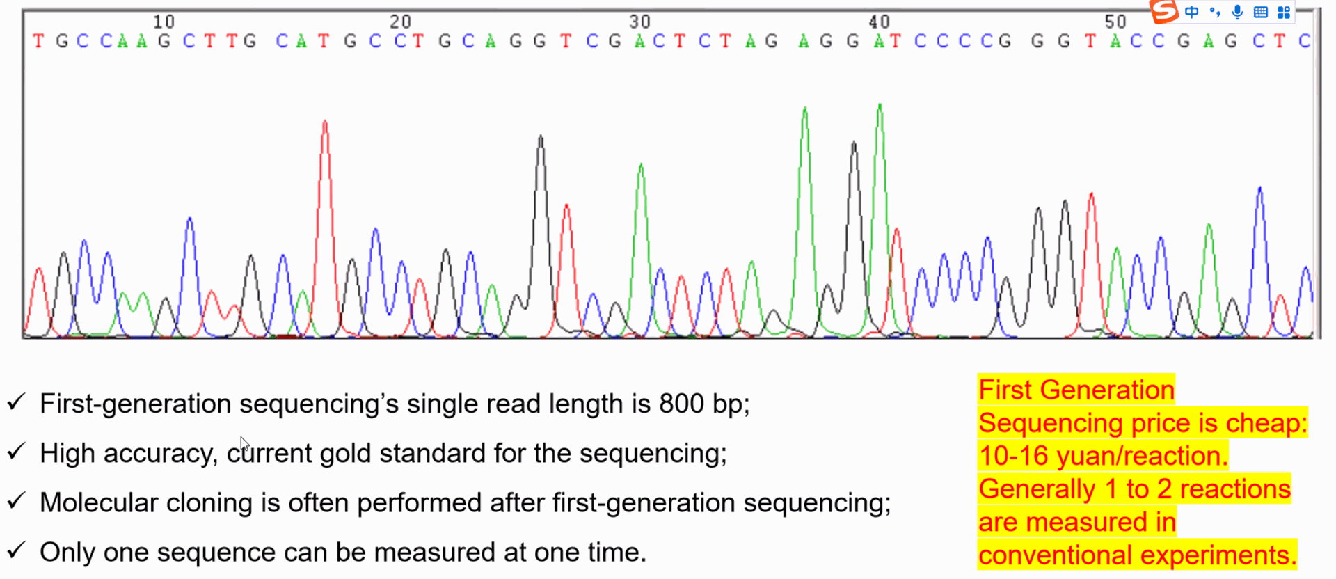 - **Read Length**: Sanger sequencing produces relatively long reads (up to 800-1000 base pairs).